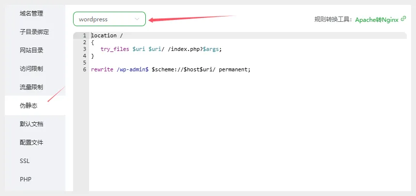 在宝塔面板,点“网站” → 找到你的站点 → “设置” → “伪静态”。