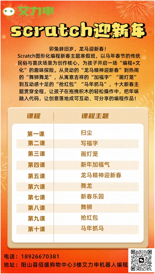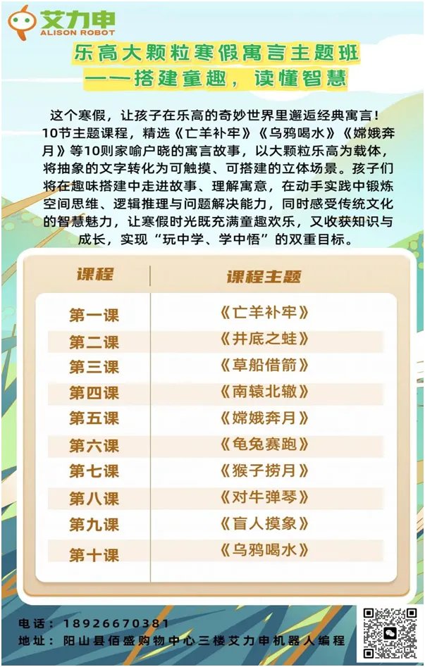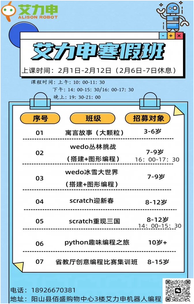 艾力申2025寒假编程机器人班重磅开课!2月1日至2月12日,10天沉浸式学习,从寓言搭建到赛事集训,3-15岁孩子都能找到专属成长赛道!每次课90分钟,共10天课程,报名优惠力度大,低至452元!3-16岁孩子均可参加,分年龄段教学,每个年龄段仅开放20个学位,招满即止,快来加入吧!