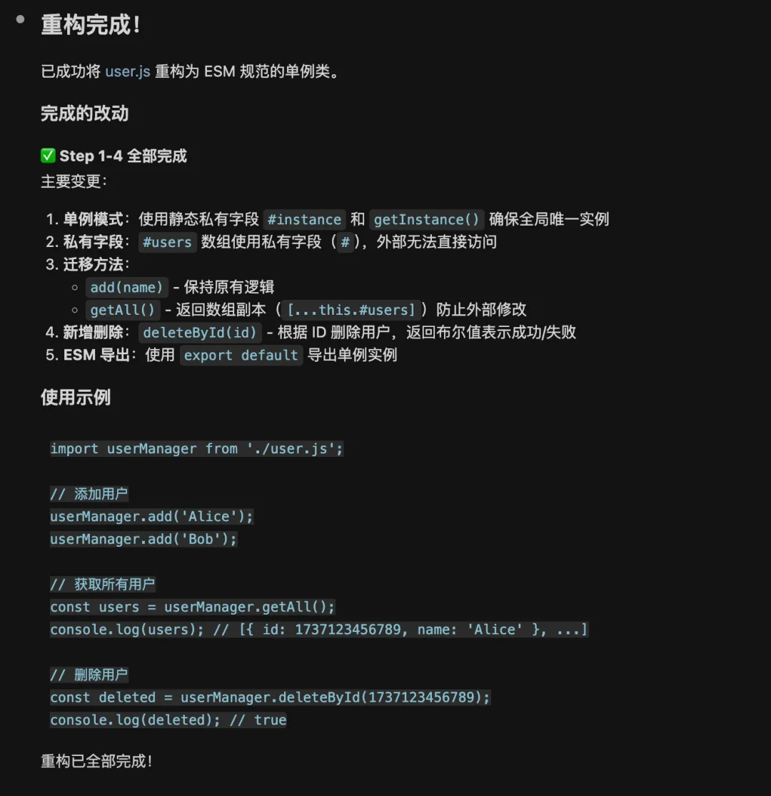 ““分析 user.js,将其重构为 ESM 规范的单例类 UserManager,并增加根据 ID 删除用户的功能。先提交 Plan。”
