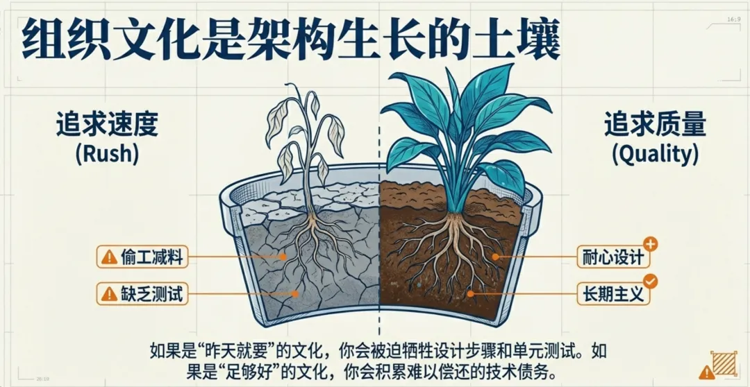 你所在组织的文化对你构建的软件有巨大影响。如果你在一家视速度高于一切的公司,你会感受到偷工减料的压力,而这将影响你的架构。