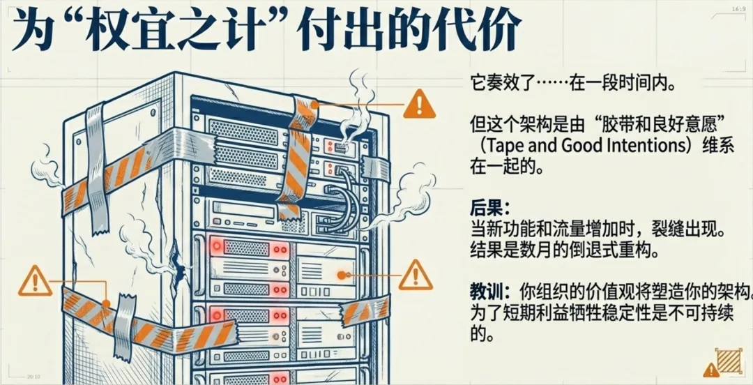 它奏效了——在一段时间内。但很快,那些权宜之计就开始让我们付出代价。那个由胶带和良好意愿维系在一起的架构,在面对新功能、增加的流量和扩展性需求时开始出现裂痕。最终,我们别无选择,只能付出代价:大量的错误修复和重构让我们倒退了数月。