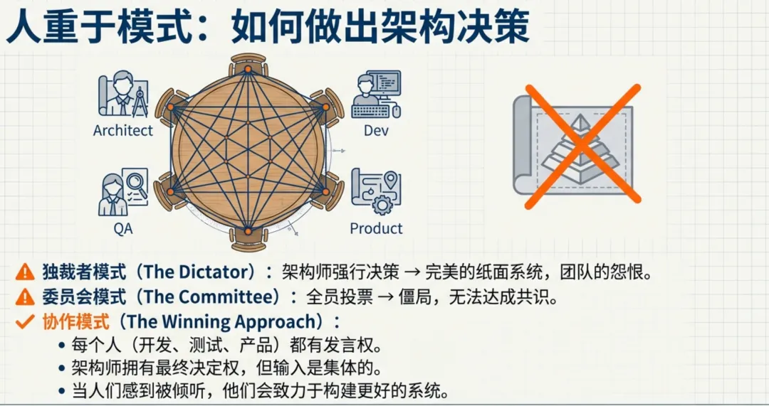 当人们感到自己参与了过程时,他们会更投入地去促成成功。架构变成了团队共同构建的东西,而不是从上面传达下来的东西。