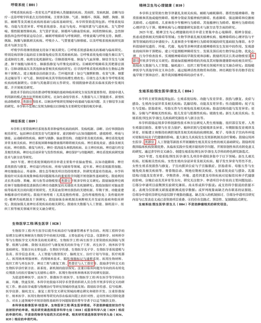 医学科学部:呼吸系统(H01)聚焦肺部疾病类器官模型、神经系统(H09)助力神经退行性疾病机制探索、精神卫生与心理健康(H10)支持类器官多学科交叉研究、生殖系统/围生医学/新生儿(H04)鼓励子宫内膜类器官等生殖健康研究、生物医学工程/再生医学(H28)推动“类器官+芯片/AI”高通量筛选技术发展。这意味着,无论聚焦神经、精神卫生、生殖、呼吸还是再生医学领域,类器官都能成为提升课题创新性的核心抓手。