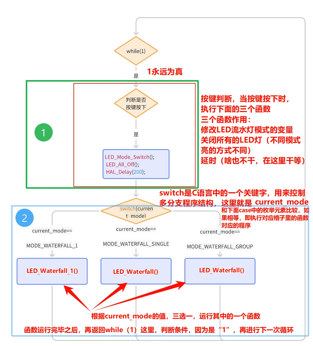 /* 主循环 */while (1){/* 检测按键是否按下,按下则切换模式 */if(KEY_Check() == 1){LED_Mode_Switch(); // 切换流水灯模式LED_All_Off(); // 切换模式前熄灭所有LED,避免混亮HAL_Delay(200); // 防连按:短延时避免一次按键切换多次}/* 根据当前模式执行对应流水灯函数 */switch(current_mode){case MODE_WATERFALL_1:LED_Waterfall_1();break;case MODE_WATERFALL_SINGLE:LED_Waterfall();break;case MODE_WATERFALL_GROUP:LED_Waterfall_Group();break;default:current_mode = MODE_WATERFALL_1; // 异常时默认模式1break;}}