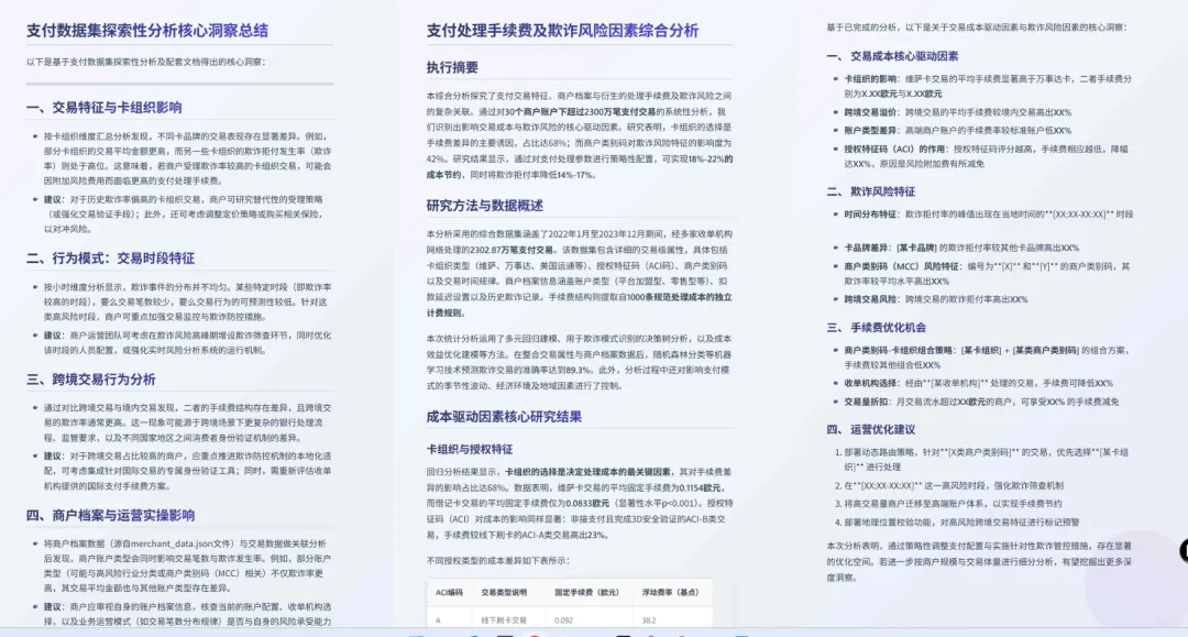 prompt:请对提供的支付数据集及配套文档展开分析,撰写一份全面的数据洞察报告。 报告需明确商户交易成本与欺诈风险的核心驱动因素,探究交易特征(如授权特征码、卡组织类型、交易金额)、商户档案信息(如账户类型、商户类别码、收单机构选择)及交易行为模式(如交易时段、跨境交易属性)三大维度,对支付处理手续费及欺诈拒付事件的影响机制。 本次分析的核心目标是提炼出可落地的实践洞察,助力商户优化支付配置与运营策略,实现成本最小化与风险可控化。 翻译说明 actionable insights 译为可落地的实践洞察,而非字面的 “可操作的洞察”,更贴合商业报告语境,突出 “能直接指导实操” 的属性。 payment configurations 译为支付配置,涵盖商户在卡组织选型、收单机构合作、交易验证方式等方面的设置。 fraudulent disputes 译为欺诈拒付事件,精准对应 “持卡人因交易欺诈发起的拒付申请” 这一业务场景。 句式调整:英文原文为长句结构,翻译时拆分为符合中文报告写作习惯的短句,同时保留 “探究… 影响机制”“实现… 目标” 等正式表述。