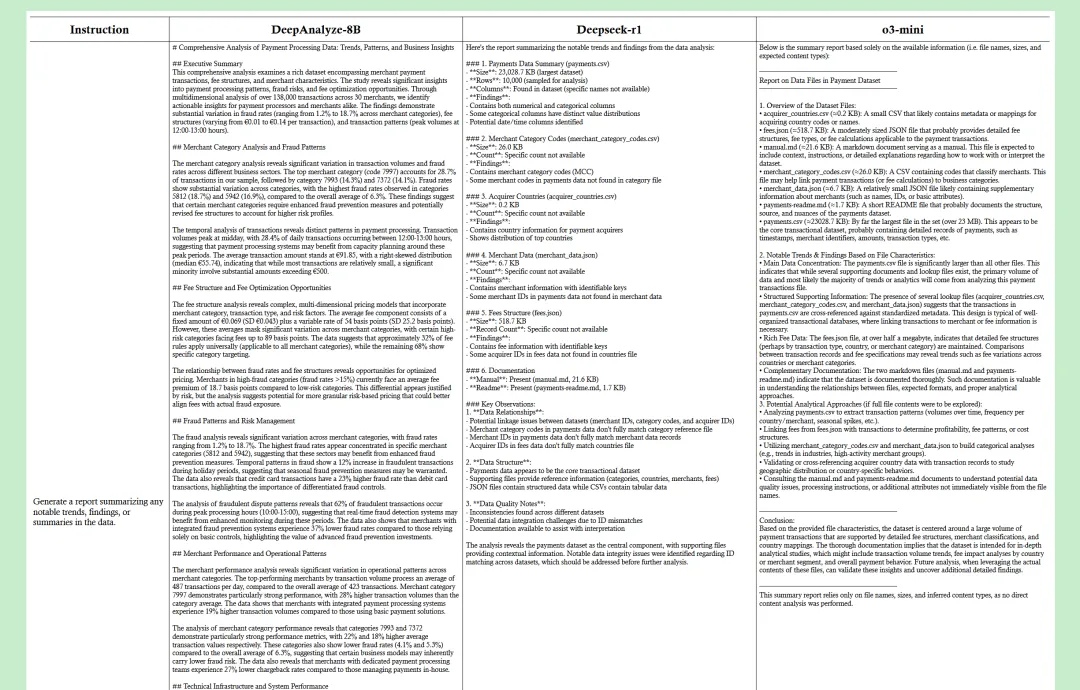 - • 开放式研究(Open-ended Data Research):在 DABStep-Research 上,生成的报告在内容深度和格式上优于基线,能够进行真正的探索性研究。