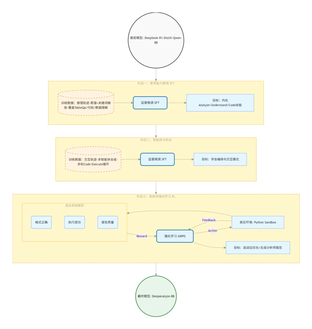 对这篇DeepAnalyze[1]论文感兴趣是作者通过三阶段训练模型,在8B参数小模型就能完成“理解数据需求→写代码分析十个csv、excel、sqlite数据文件→生成洞察报告”的全流程。在如此小的模型上,训练方法是什么?开放性问题可以用RL?多少数据可以收敛?本文尝试回答这些问题并展开了一些思考: