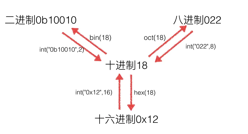 #10进制转为2进制>>> bin(10)'0b1010'#2进制转为10进制>>> int("1001",2)9#10进制转为16进制>>> hex(10)'0xa'#16进制到10进制>>> int('ff', 16)255>>> int('0xab', 16)171#16进制到2进制>>> bin(0xa)'0b1010'>>>#10进制到8进制>>> oct(8)'010'#2进制到16进制>>> hex(0b1001)'0x9'