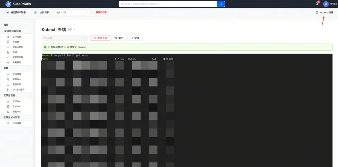 - • Web 终端:不仅能进 Pod,还能直接 SSH 远程节点。