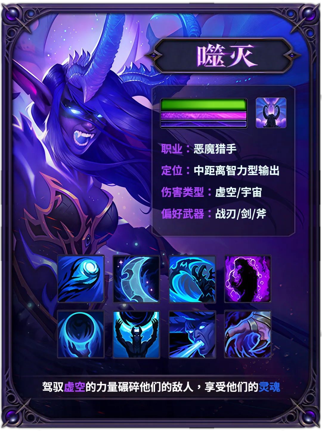 噬灭是恶魔猎手的第三个专精,但有别于其他恶魔猎手,他们放弃了邪能,转而利用虚空的力量。这些施法者挥舞着战刃,收割着灵魂,拥有足以碾碎星球的实力。