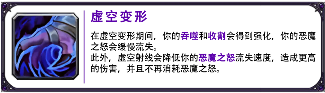在虚空变形状态下,吞噬会被强化,伤害增加/读条时间缩短,并且施放后会缩短收割的冷却时间。