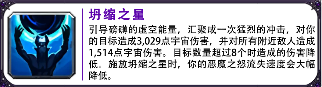 施放坍缩之星时,恶魔之怒流失速度会降低。取消坍缩之星的读条不会返还灵魂残片消耗,故而中断惩罚巨大。