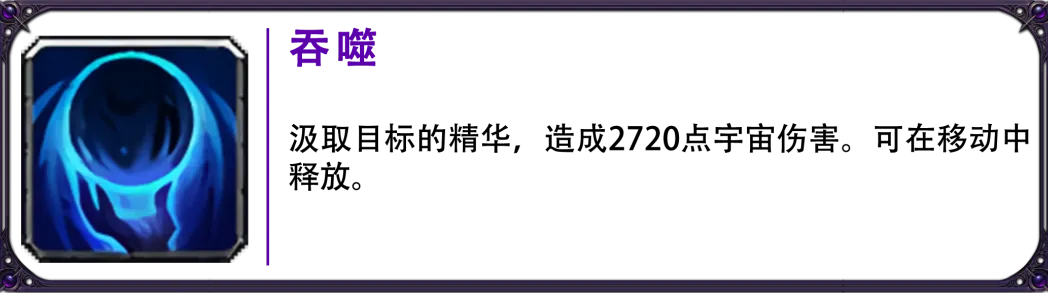 噬灭的核心资源获取手段。单体伤害技能,可移动施法。