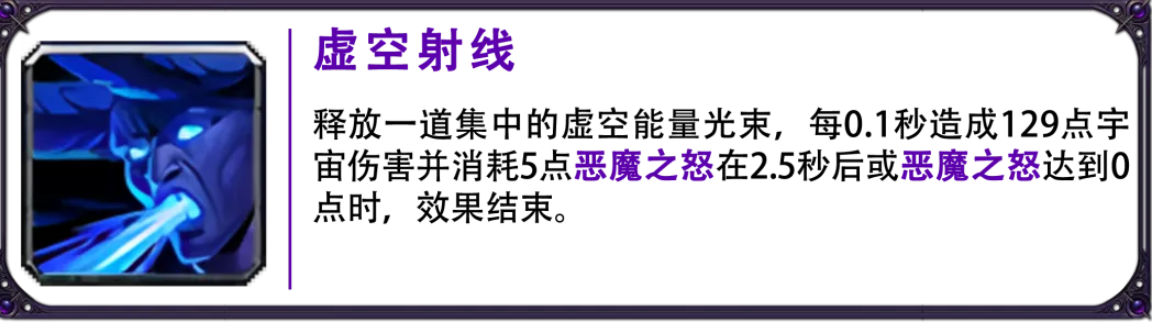 在虚空变形前,虚空射线需要100点恶魔之怒才能施放,施放后每0.1秒造成伤害并消耗5点恶魔之怒,直到引导完成或者恶魔之怒全部消耗。