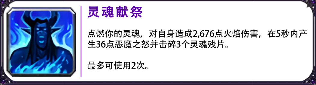 选择天赋【自发献祭】则会将灵魂献祭转换为被动形态,施放伤害法术时几率触发。
