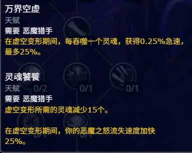 虚空变形可通过天赋获得强化,变形后吞噬灵魂时增加急速,或使变形所需的灵魂残片数量变少(但恶魔之怒消耗变多)。
