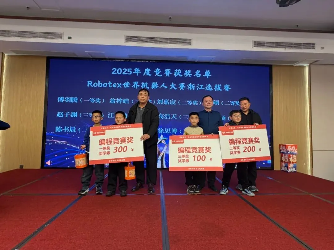竞赛获奖荣誉:“竞赛是思维的战场,也是成长的熔炉。他们以代码为矛,以逻辑为盾,在激烈的对抗中沉着应战,斩获佳绩。” 随着颁奖词响起,Rbotex 赛项、教育部白名单赛项等获奖学员依次登台。