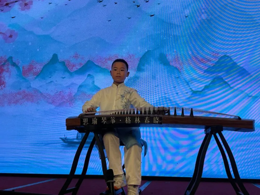 随后,徐瑾瑜同学的古筝表演《青花瓷》奏响,指尖在琴弦上灵动跳跃,古典韵味十足,仿佛将大家带入了烟雨朦胧的江南;