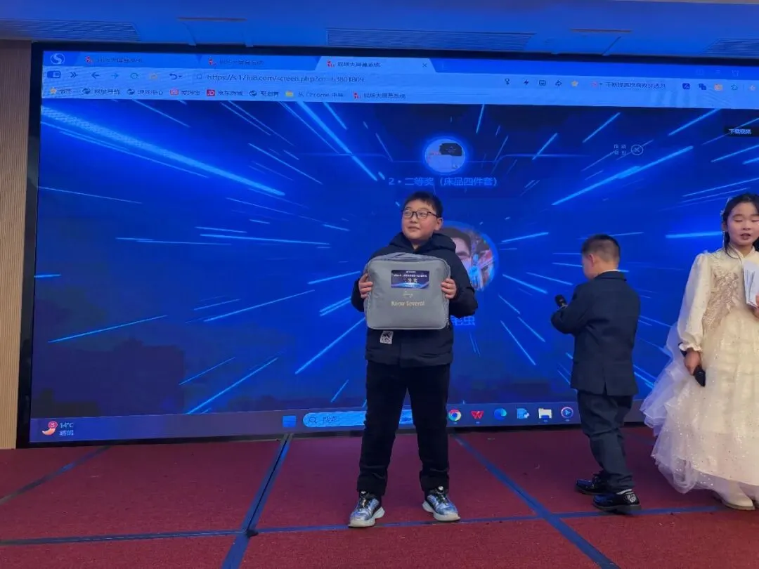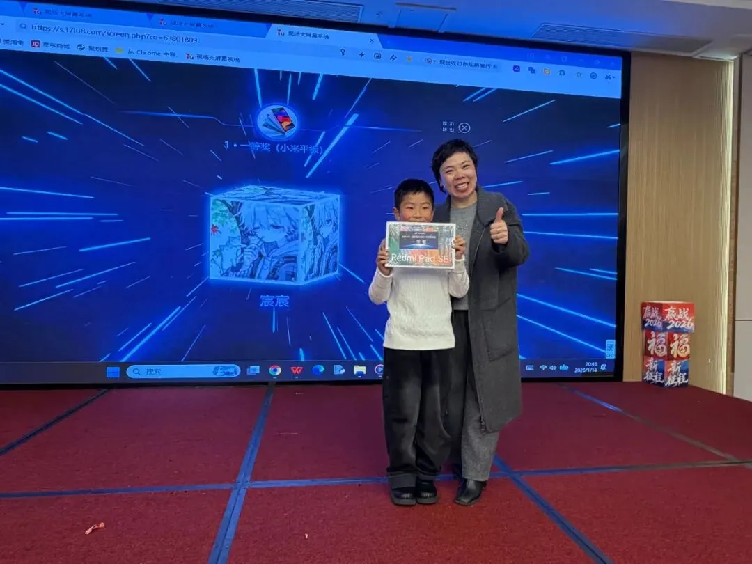 第二轮抽奖环节由小主持人,随着喊出开始,大屏幕上的头像飞速滚动又骤然定格。当头像清晰呈现的瞬间,全场立刻响起此起彼伏的欢呼,中奖的家长难掩激动,起身向舞台快步走去,脸上满是意外与欣喜,未中奖的观众也纷纷送上掌声,将现场的欢乐氛围再次推向小高潮。