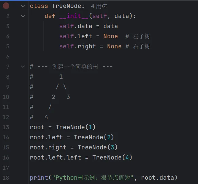 Python 的类写法非常直观,直接定义节点的“左孩子”和“右孩子”。