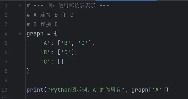 使用字典来表示图是最 Pythonic 的方式,键是节点,值是相邻节点的列表。