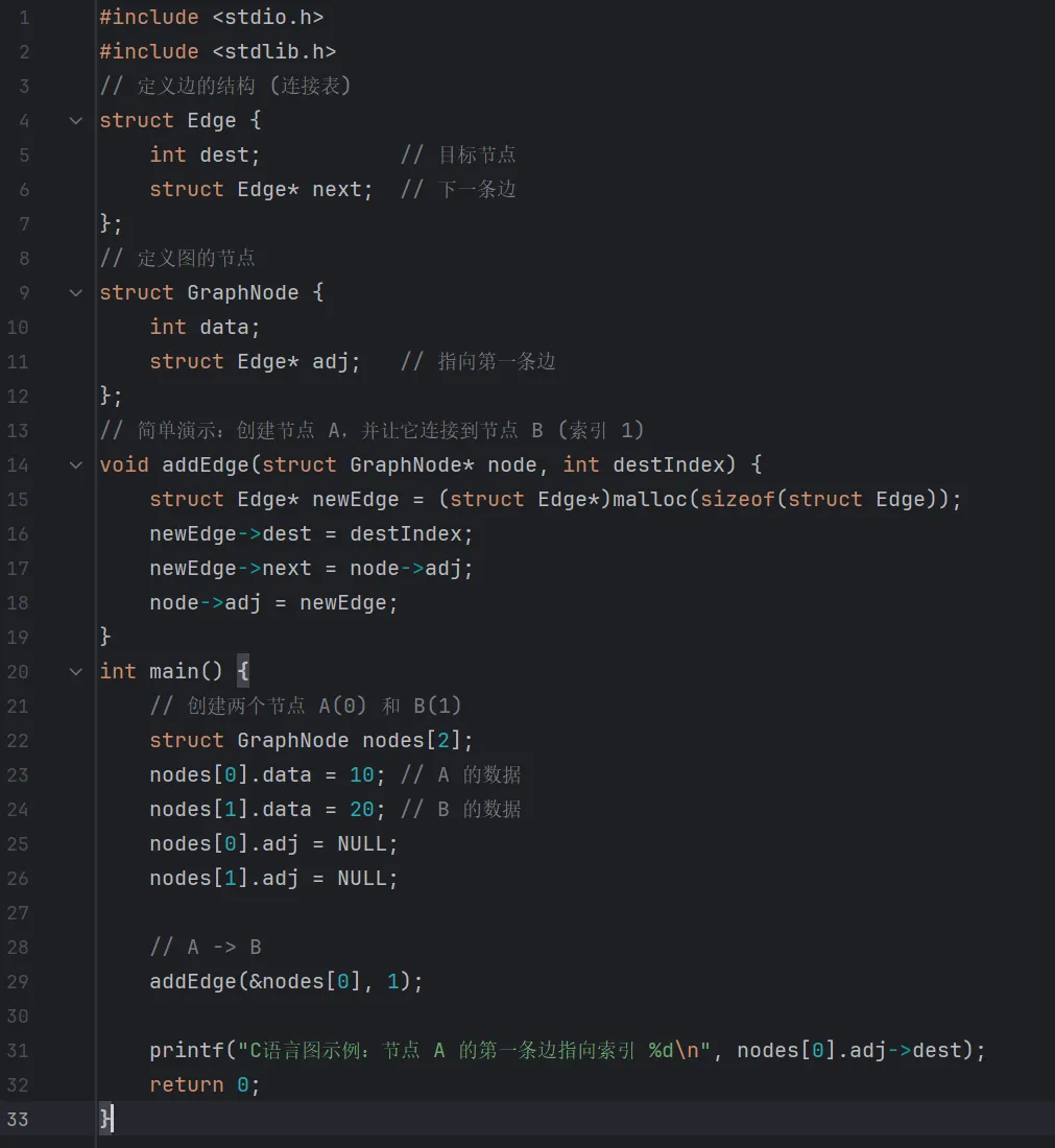 C 语言实现稍微复杂,我们用结构体来模拟一个简单的无向图节点连接。