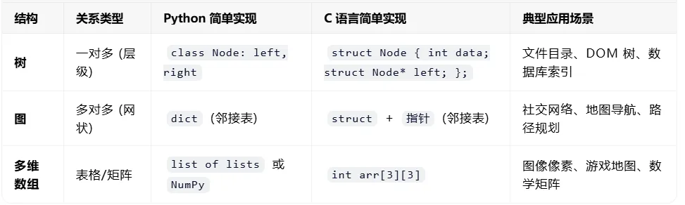 本文针对非线性数据结构的树、图和多维数组进行了论述,并举例说明。至此,我们对于数据结构的学习暂告一个段落。应该说数据结构是任何计算机语言学习中的重点,我们通过python与C语言的对比,才知道为什么说python语法简单:其实本质原因是python隐藏了特别难以理解的底层知识比如指针、内存管理等,Python 让你从繁琐的“系统级”操作中解放出来,专注于“应用级”的逻辑实现。
