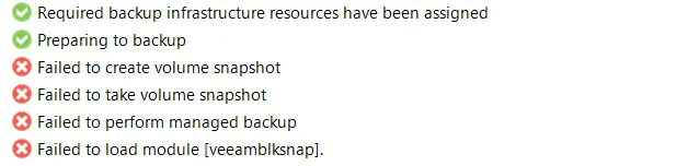 Failed to perform managed backupFailed to create volume snapshotFailed to load module [veeamblksnap].Failed to take volume snapshot