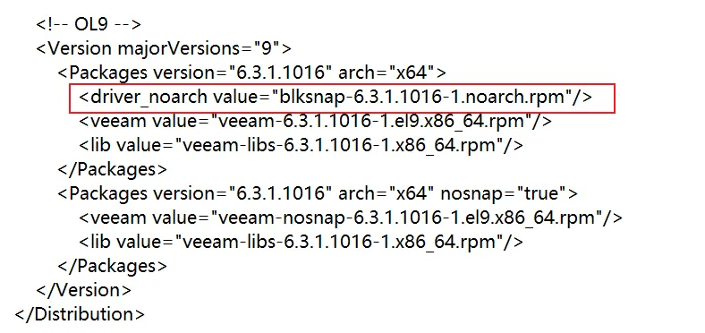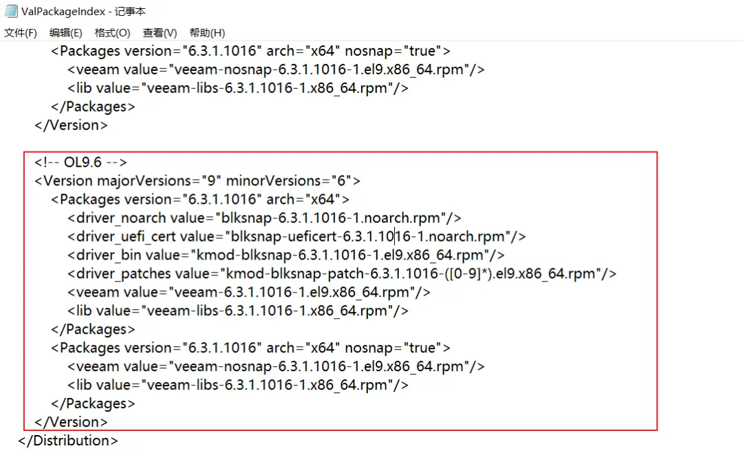 手动修改 C:\ProgramData\Veeam\Agents\VAL\ValPackageIndex 文件,将 Oracle Linux 9.6 的版本映射加进去: