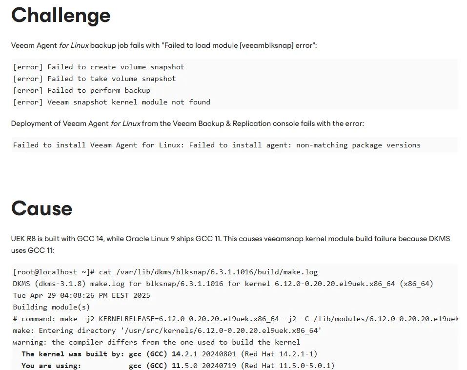 本来我已经准备放弃继续折腾了,CASE 也已经开好,等官方慢慢拉日志分析。结果今天不死心又去搜了一下错误关键字,居然搜到了一篇非常符合的 KB 文档::Failed to load module [veeamblksnap] on Oracle Linux 9 with UEK R8 kernel[3],简直太符合我现在的这个问题了。