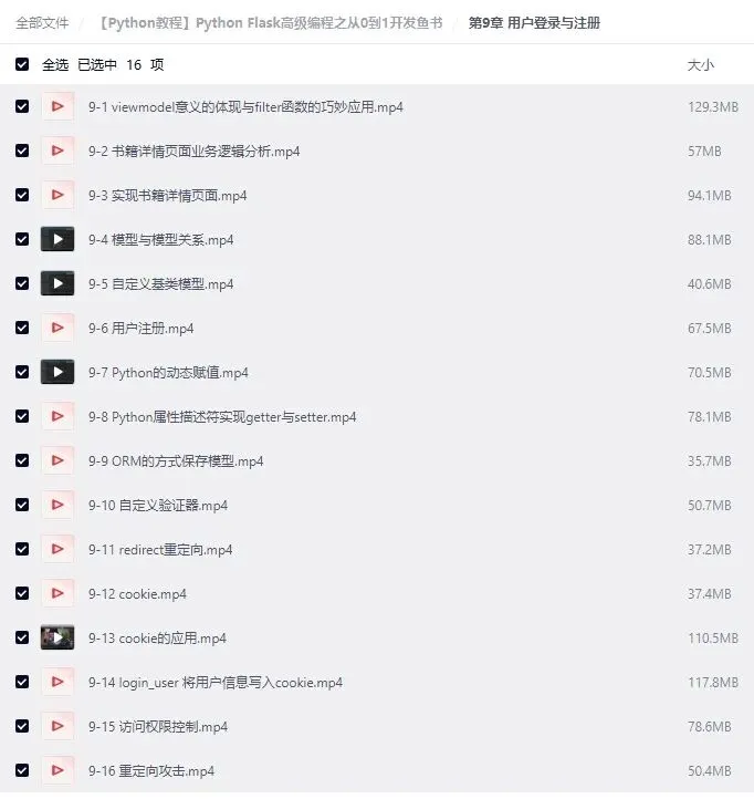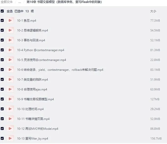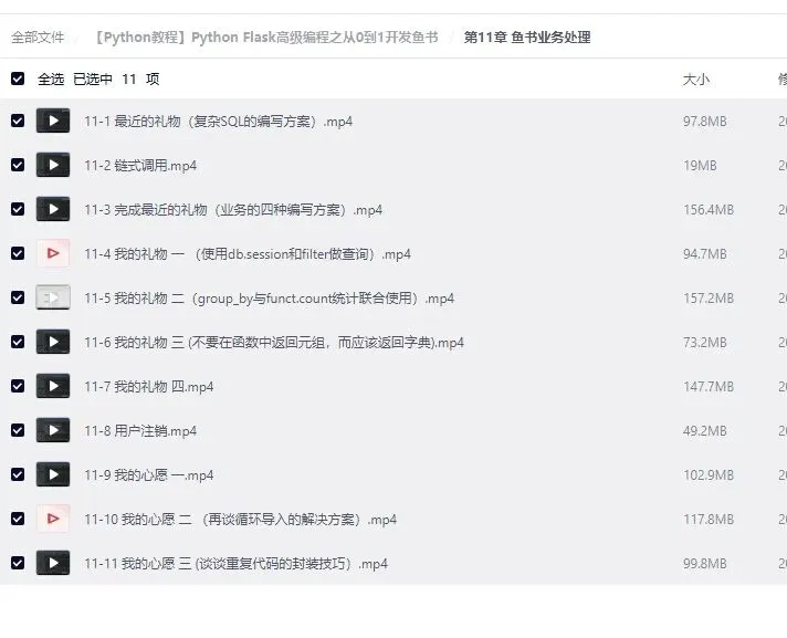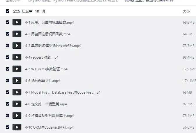 - (全章节共10个视频,覆盖蓝图拆分、视图函数配置、ORM模型构建等实战技能)