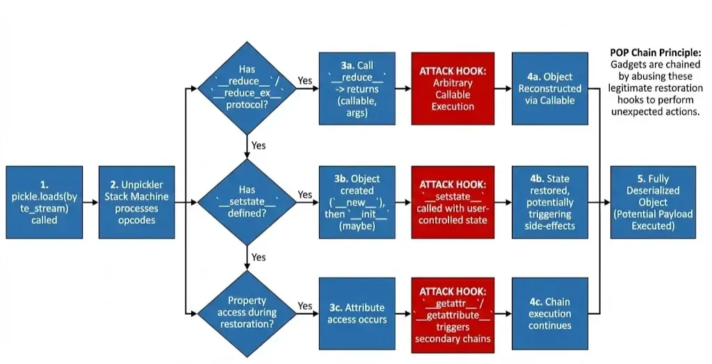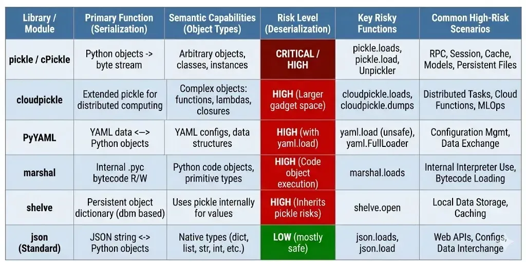 | Opcode 级手工构造 (Stealth RCE) | | pickle | 无需魔术方法 | 高隐蔽 / 中复杂度 | 目标后端仅通过正则扫描源代码字符串,而非深度解析序列化逻辑 |