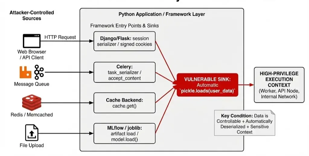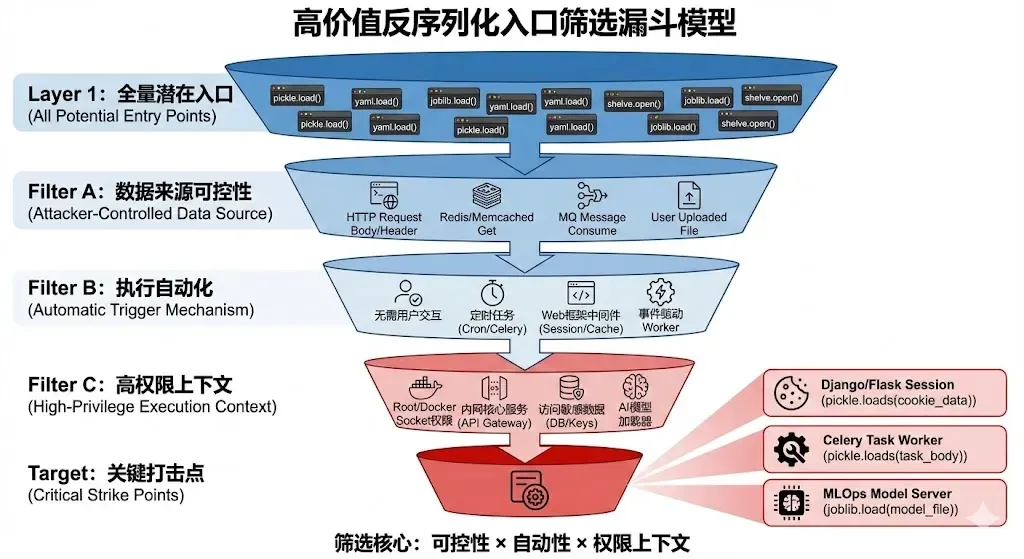 找出「可被外部影响、自动反序列化、且位于高价值执行上下文」的点