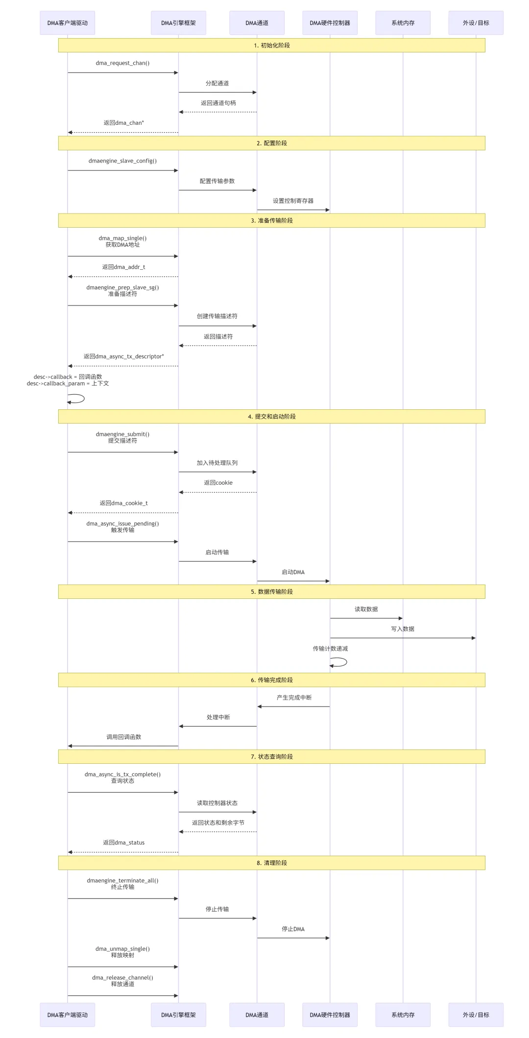 以下是DMA客户端(使用者)与DMA引擎框架的完整交互时序图,展示了从初始化到传输完成的完整流程: