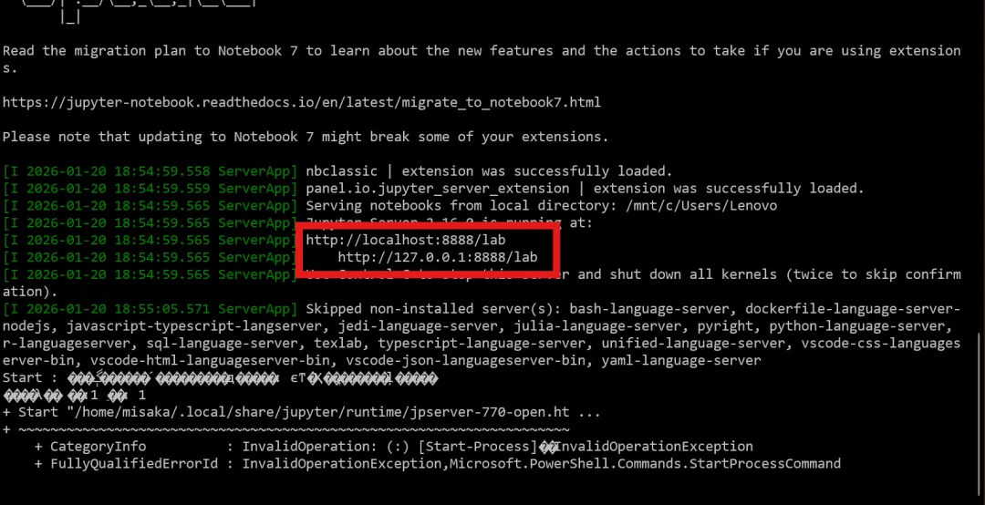 会跳出来一堆东西,这时候在里面复制这个网址(http://localhost:8888/lab)到浏览器打开即可(你也可以找教程配置成自己打开,这里不赘述了)。打开后可能会让你设置或输入密码,设一个简单的就好。