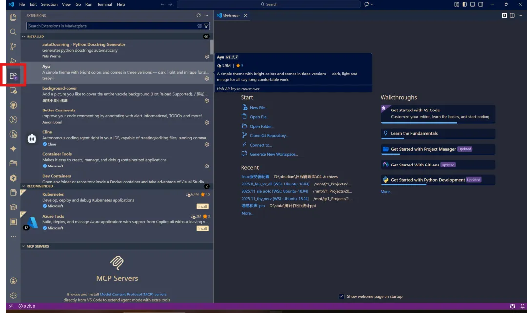 VS Code 本身只是一个编辑器,它的强大在于“插件”。 打开 VS Code,点击左侧活动栏的 扩展图标(四个方块组成的图标,快捷键 Ctrl+Shift+X),在搜索框输入并安装以下插件:
