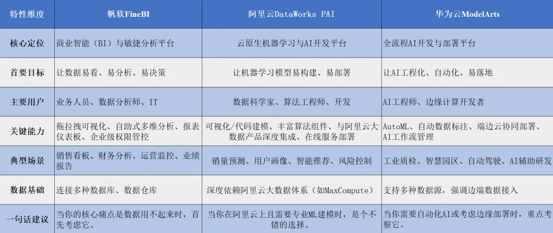 A2:FineBI的学习曲线最平缓,业务人员经过短期培训即可自主分析。PAI和ModelArts的可视化建模部分也降低了一定门槛,但要真正用好、调出好模型,仍然需要使用者具备数据科学和机器学习的基础知识。它们降低了操作复杂度,但没有降低对思维逻辑的要求。