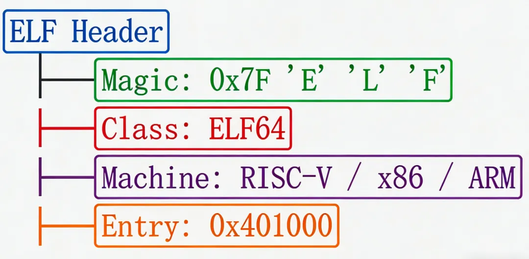 ELF Header 在文件最前面,告诉系统: