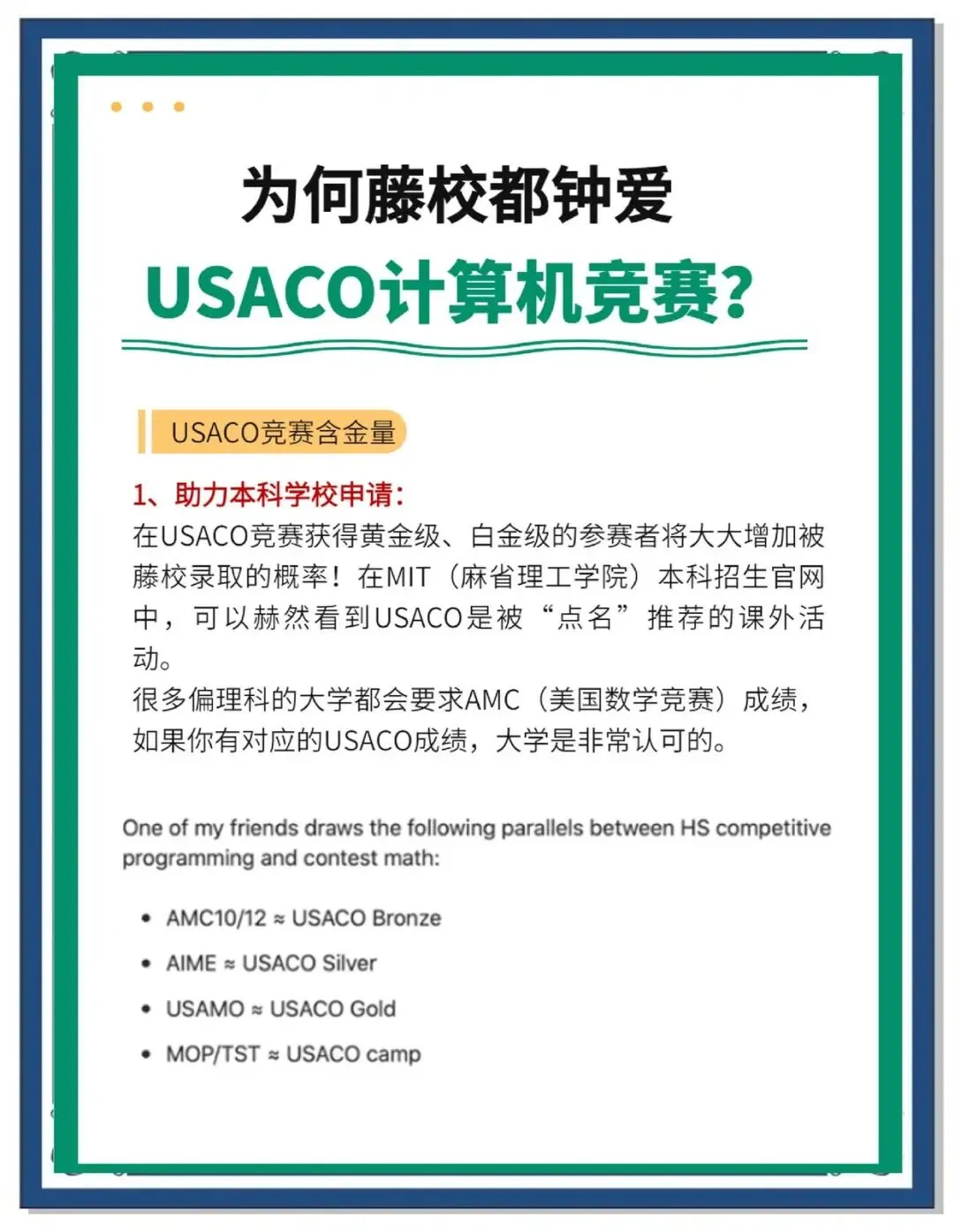 如果你有梦想进入如MIT、斯坦福这样的顶尖高校,那么USACO的成绩无疑会是你进入藤校的大杀器🚀。