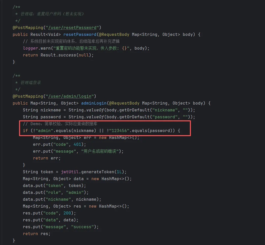 这意味着什么?意味着只要我不改代码,全宇宙的人都能用这个账号登录后台。这也意味着,所谓的“安全”,在这个项目里就是一个笑话。