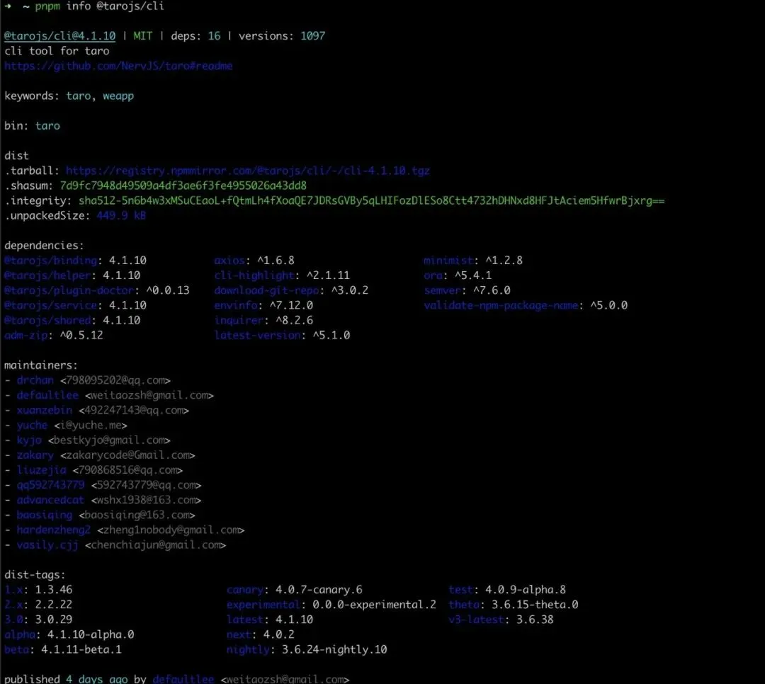 $ pnpm info @tarojs/cli