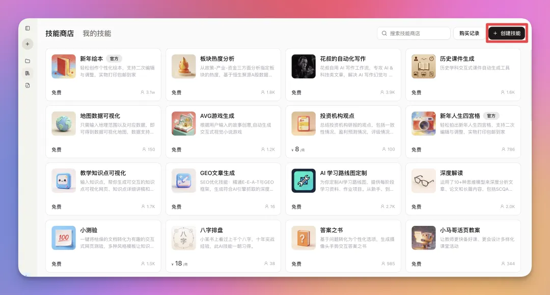 比如你想做个金句卡片,或者数据分析,直接搜一下,大概率有现成的技能能用。