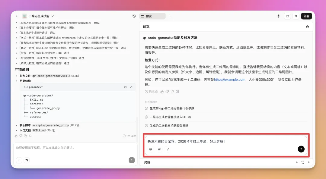 这个时候,点击右上角的“部署”按钮,然后点“开始部署”。以后你想快速生成二维码,直接调用这一个Skill就行。下次要用这个技能也是直接在扣子官网上就能用,@上对应的技能,输入内容。你做好的Skills,在技能商店的“我的技能”里就能看到。