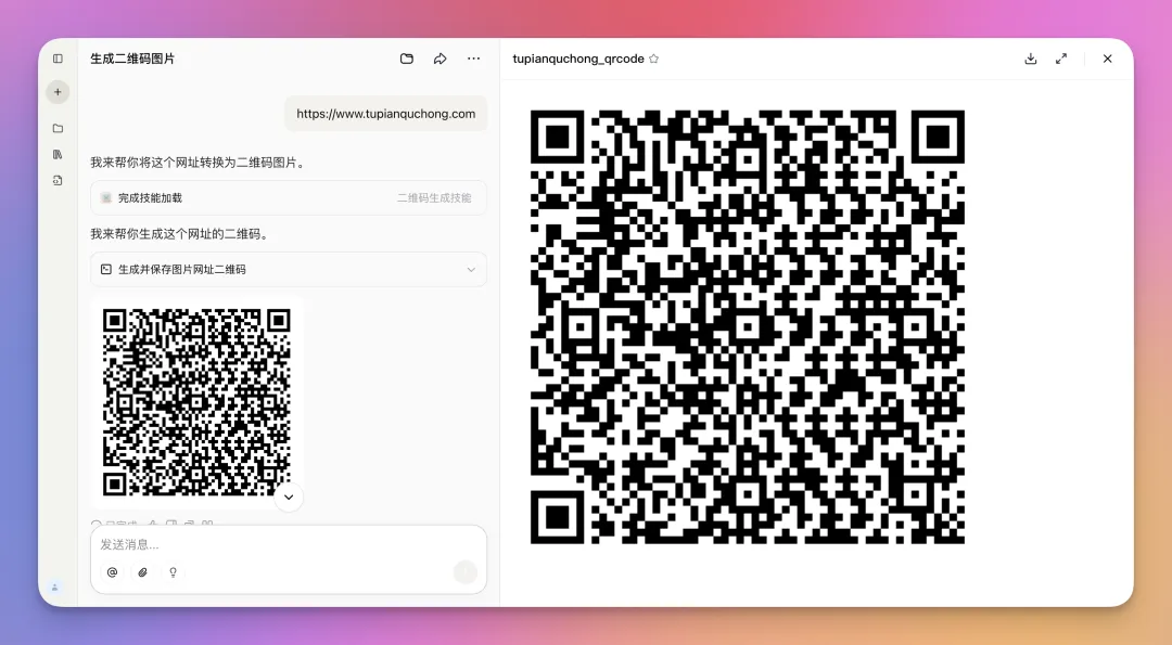 “帮我做一个能生成二维码图片的Skill,功能包括:接收用户输入的文本或网址,自动调用开源的二维码生成库,生成可直接下载、扫码可用的二维码图片。”