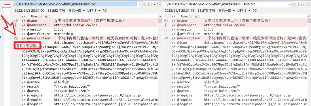 还有个超方便的小功能:比对完成后,点击界面左侧的箭头,就能一键将该区域的内容复制到右侧,不管是表格、文件还是代码,内容同步都超便捷。另外,我们可以点击左边的箭头,可复制区域的内容至右边,非常方便哟!