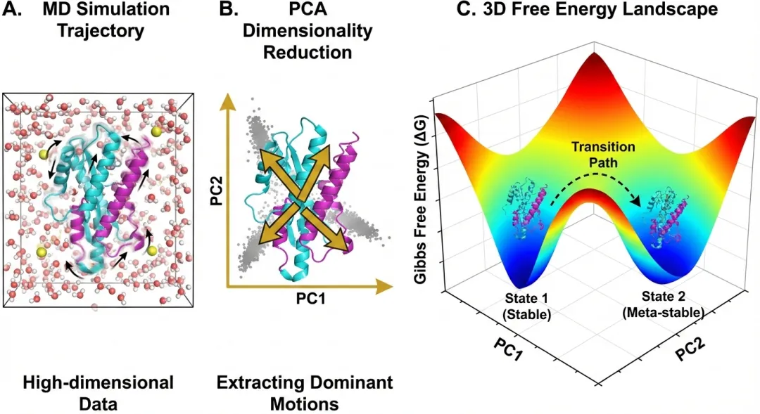 面对庞杂的原子运动轨迹,科学家常常借助主成分分析这一强大的统计工具。简单来说,PCA 能在一大堆看似混乱的运动中,找出几个最能代表整体构象变化的“主成分”,也就是最核心的运动模式。
