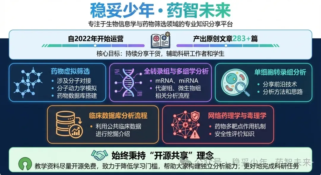 稳妥少年·药智未来 生信学习资料合订本(分子对接、动力学模拟、转录组分析、单细胞分析、分析流程),转发学习参与课程抽奖