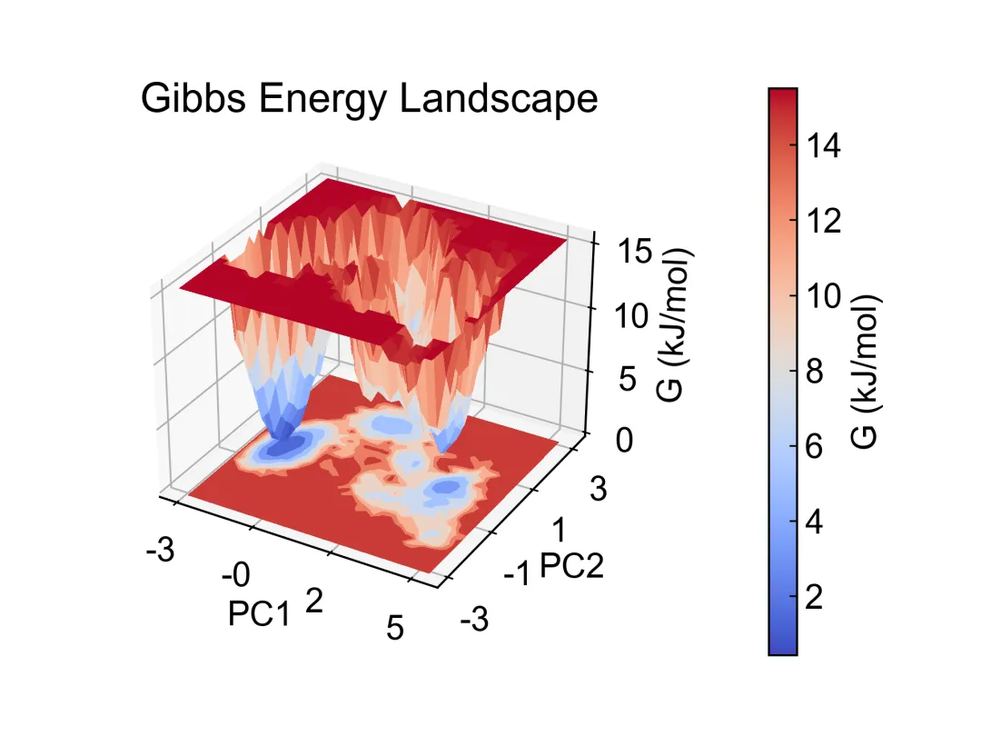 得到主成分投影后,我们就能进一步构建自由能景观。你可以将其想象成一个“能量地形图”:横纵坐标是 PC1 和 PC2,代表不同的构象状态;颜色高度则代表自由能的高低。