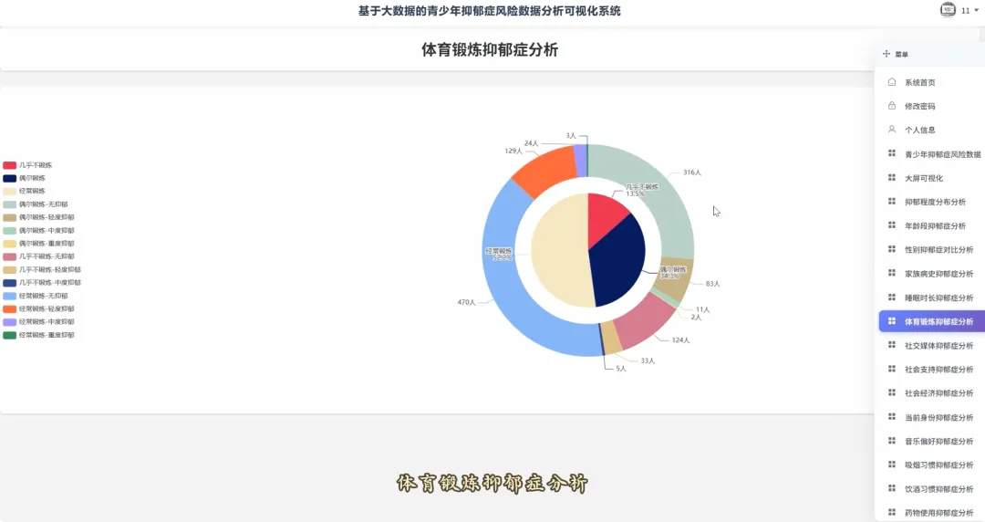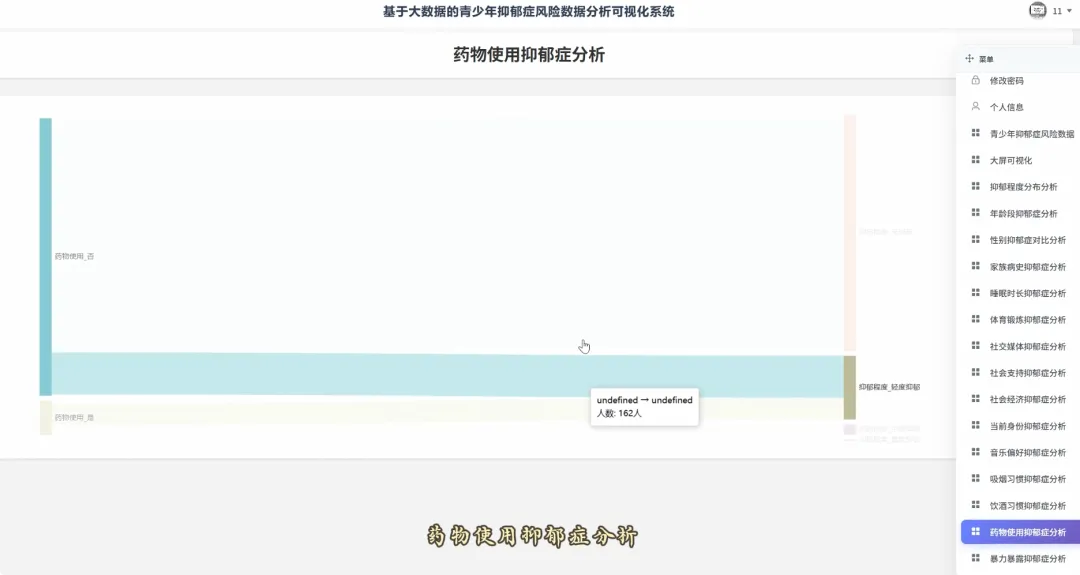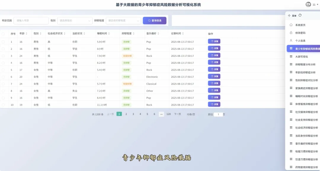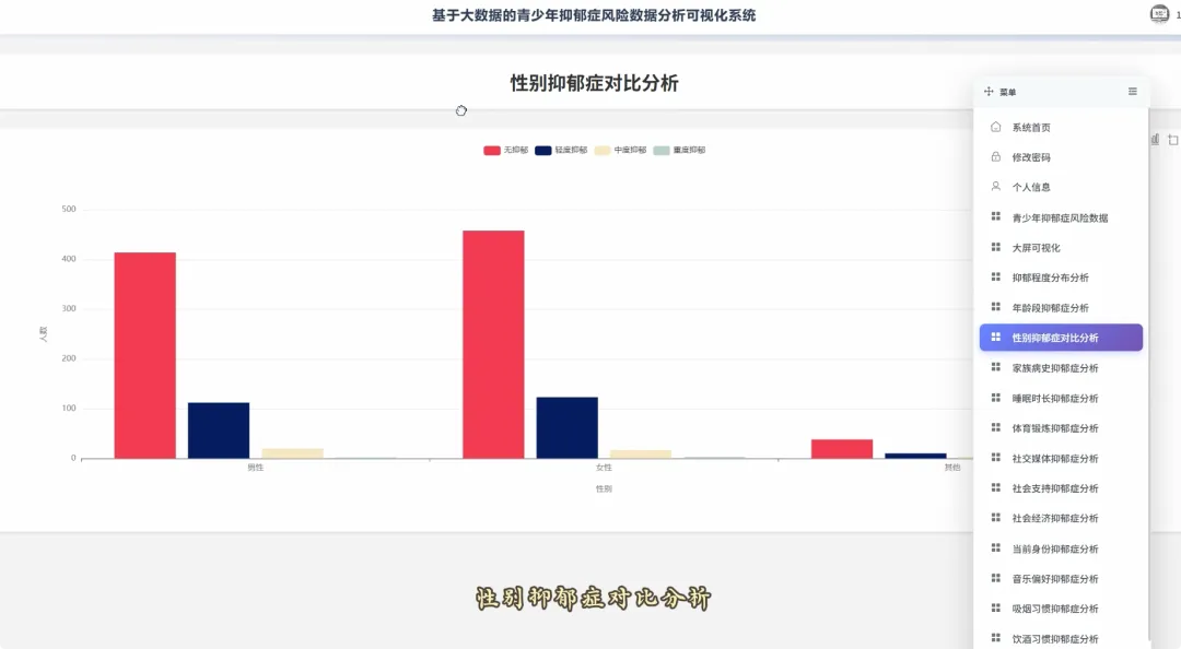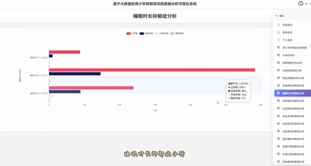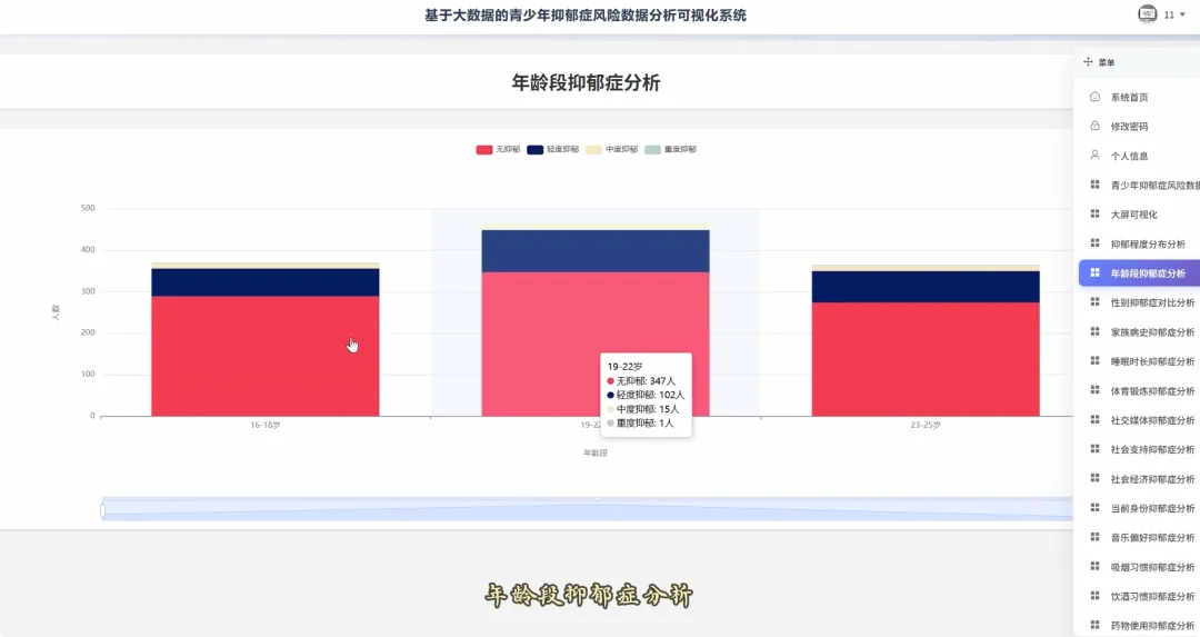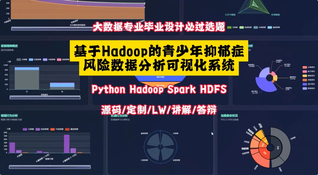 from pyspark.sql import SparkSessionspark = SparkSession.builder.appName("YouthDepressionAnalysis").getOrCreate()df = spark.read.csv("hdfs://namenode:8020/user/hadoop/depression_data.csv", header=True, inferSchema=True)def analyze_overall_depression_distribution(): global df result_df = df.groupBy("depression_severity").count().orderBy("count", ascending=False) data_list = [{"name": row['depression_severity'], "value": row['count']} for row in result_df.collect()] return data_listdef analyze_gender_vs_depression(): global df result_df = df.groupBy("gender", "depression_severity").count().orderBy("gender", "count", ascending=False) data_list = [{"gender": row['gender'], "severity": row['depression_severity'], "count": row['count']} for row in result_df.collect()] return data_listdef analyze_sleep_hours_vs_depression(): global df from pyspark.sql.functions import when, col binned_df = df.withColumn("sleep_category", when(col("sleep_hours") < 6, "睡眠不足(<6小时)").when((col("sleep_hours") >= 6) & (col("sleep_hours") <= 8), "正常睡眠(6-8小时)").otherwise("睡眠过多(>8小时)")) result_df = binned_df.groupBy("sleep_category", "depression_severity").count().orderBy("sleep_category", "count", ascending=False) data_list = [{"sleep": row['sleep_category'], "severity": row['depression_severity'], "count": row['count']} for row in result_df.collect()] return data_list